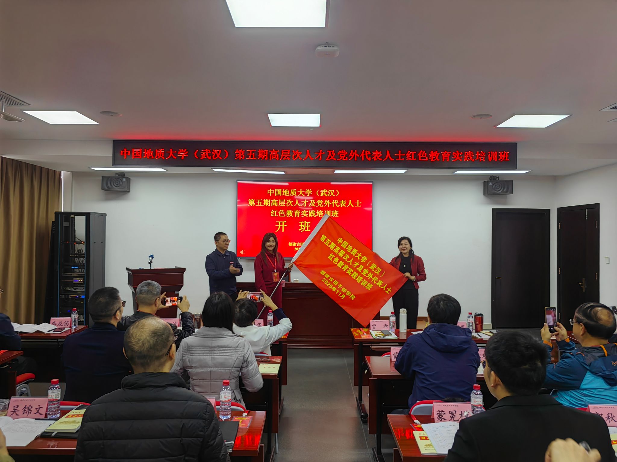 开班仪式上,福建古田干部学院、中共龙岩市委党校党委(院、校)办公室(业务指导部)主任张炜琎致辞并向学员代表授班旗。张炜琎对我校高层次人才及党外代表人士一行表示欢迎,系统介绍了闽西地区的光荣革命历史以及古田干部学院的办学特色与教学资源。